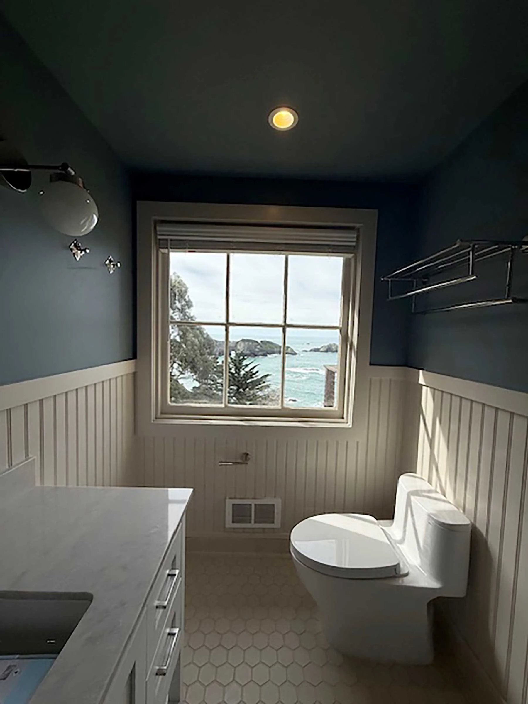 Phase 1 drew from the land——soft spa greens and warm whites, grounding and restorative. Phase 2 looked to the water——calm, sophisticated blues that mirror the vast Pacific beyond the windows. Across both phases, custom vanities, handmade California tile from a B Corp certified maker, and polished nickel fixtures throughout maintained an unwavering standard of quality and craftsmanship.